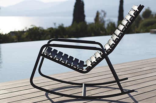 CLICK is a collection of outdoor furniture consisting of Dining chairs, Sunrockers, Sunbeds, Rocking chairs, Lounge chairs and Position chairs. CLICK is made in a powder coated metal with intelligent designed plastic lamellas and bamboo. CLICK provides you with excellent cushion free comfort and the flexibility to personalise the color of your chair with our range of colours.